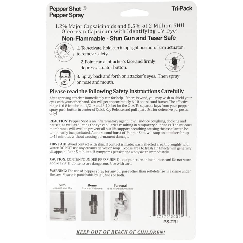 Pepper Shot 1.2% MC Tri-pack pepper spray. Pepper Shot Pepper Spray is made with 1.2% Major Capsaicinoids. The Major Capsaicinoids are the true heat measure and Pepper Shot 1.2% MC is more effective than of most other pepper sprays. In addition to causing an attacker pain, The Pepper Shot 8.5% oleoresin capsicum formula swells the mucous membranes, which makes breathing difficult, and swells the veins in the eyes, causing the eyes to close. It’s made from 2,000,000 SHU’s of raw pepper and these effects can last up to 45 minutes and cause no permanent damage. Has a UV identifying dye to help aid in the identification of an attacker.